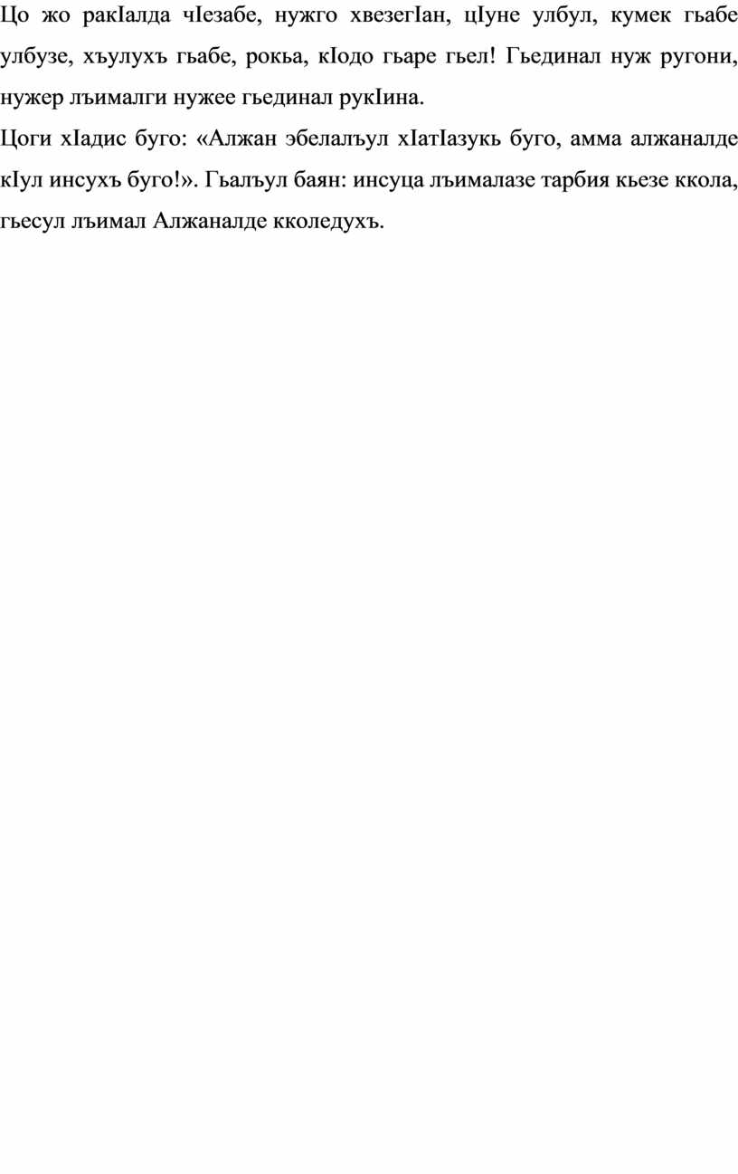 Цоги хIадис буго: «Алжан эбелалъул хIатIазукь буго, амма алжаналде кIул инсухъ буго!». Гьалъул баян: инсуца лъималазе тарбия кьезе ккола, гьесул лъимал Алжаналде кколедухъ.