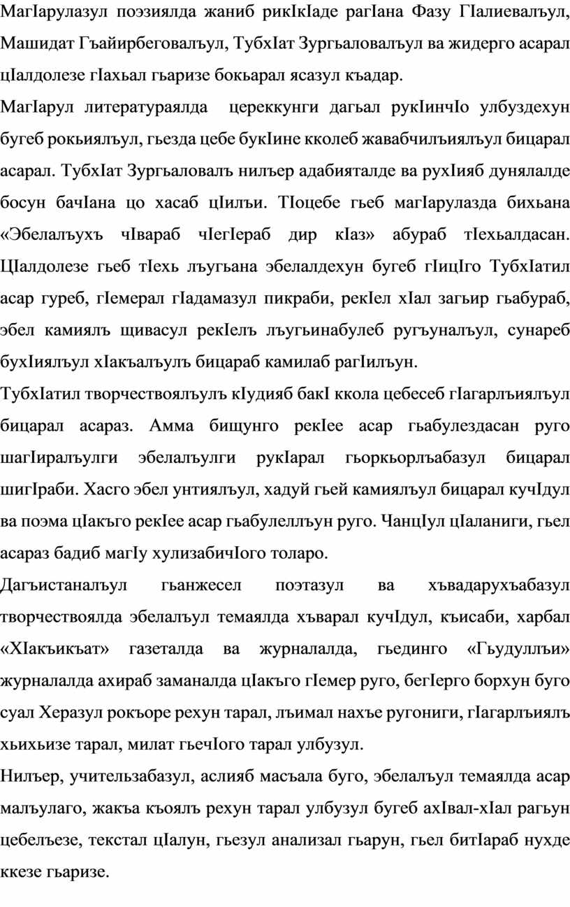 МагIарулазул поэзиялда жаниб рикIкIаде рагIана Фазу ГIалиевалъул, Машидат Гъайирбеговалъул, ТубхIат Зургьаловалъул ва жидерго асарал цIалдолезе гIахьал гьаризе бокьарал ясазул къадар.