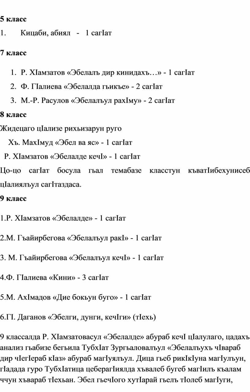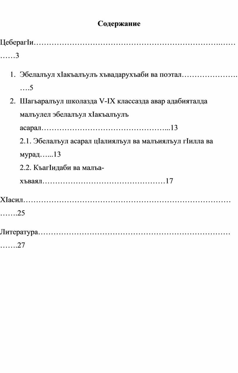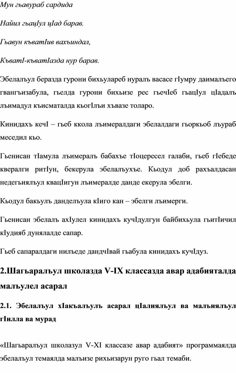2. Шагьаралъул школазда V-IX классазда авар адабияталда малъулел эбелалъул хIакъалъулъ асарал…………………………………………...13