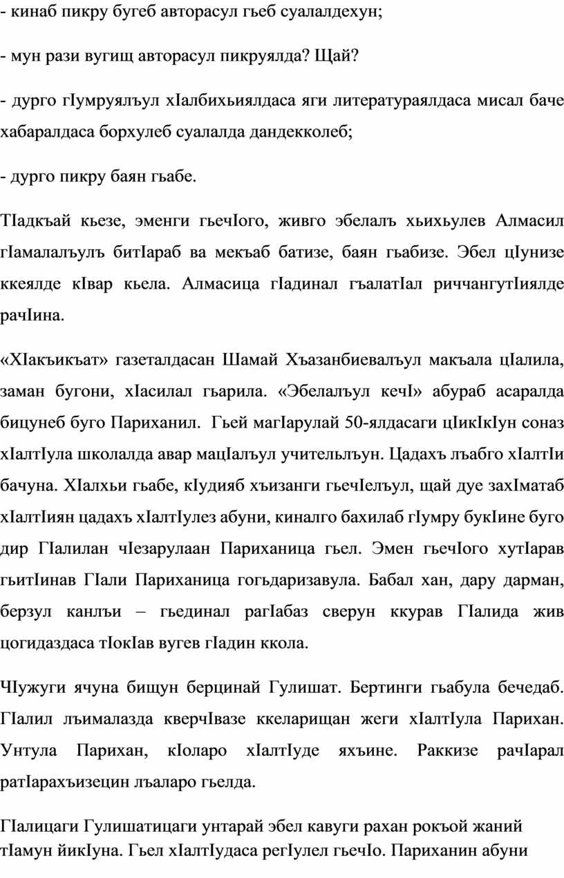 - дурго гIумруялъул хIалбихьиялдаса яги литератураялдаса мисал баче хабаралдаса борхулеб суалалда дандекколеб;