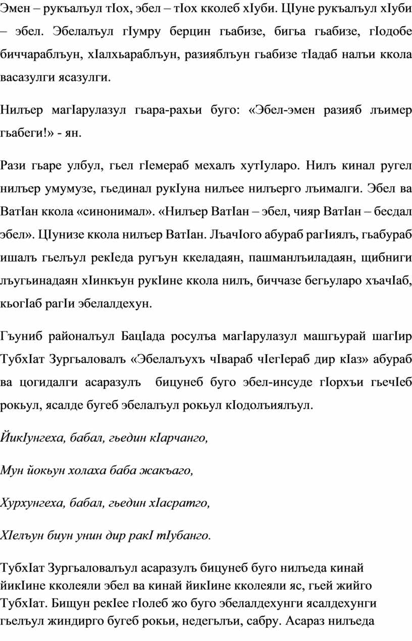Эмен – рукъалъул тIох, эбел – тIох кколеб хIуби. ЦIуне рукъалъул хIуби – эбел. Эбелалъул гIумру берцин гьабизе, бигьа гьабизе, гIодобе биччараблъун, хIалхьараблъун, разияблъун гьабизе тIадаб налъи ккола васазулги ясазулги.