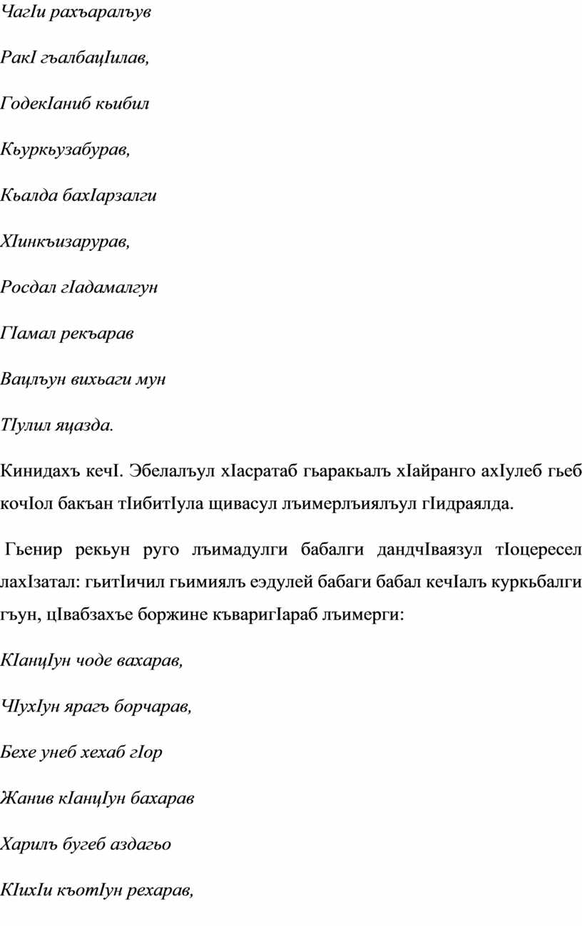 Гьаб биценги бицун, лъимал тIамила ургъизе. ЧIужу ячингун, эбел-эменгун цадахъ гIумру гьабизе ккараб мехалъ, гIемерисезул данде кколаро эбелалъулгун, росасул яцалъулгун. ГIолохъанав росасда лъазе ккола битIараб нух тIаса бищизе, эбел, эбел гIадин, кIодо гьайизе, йокьулей чIужуялдаги берцинго бичIчIизабизе кинал ритIарал, кинал тIекъал ругелали.