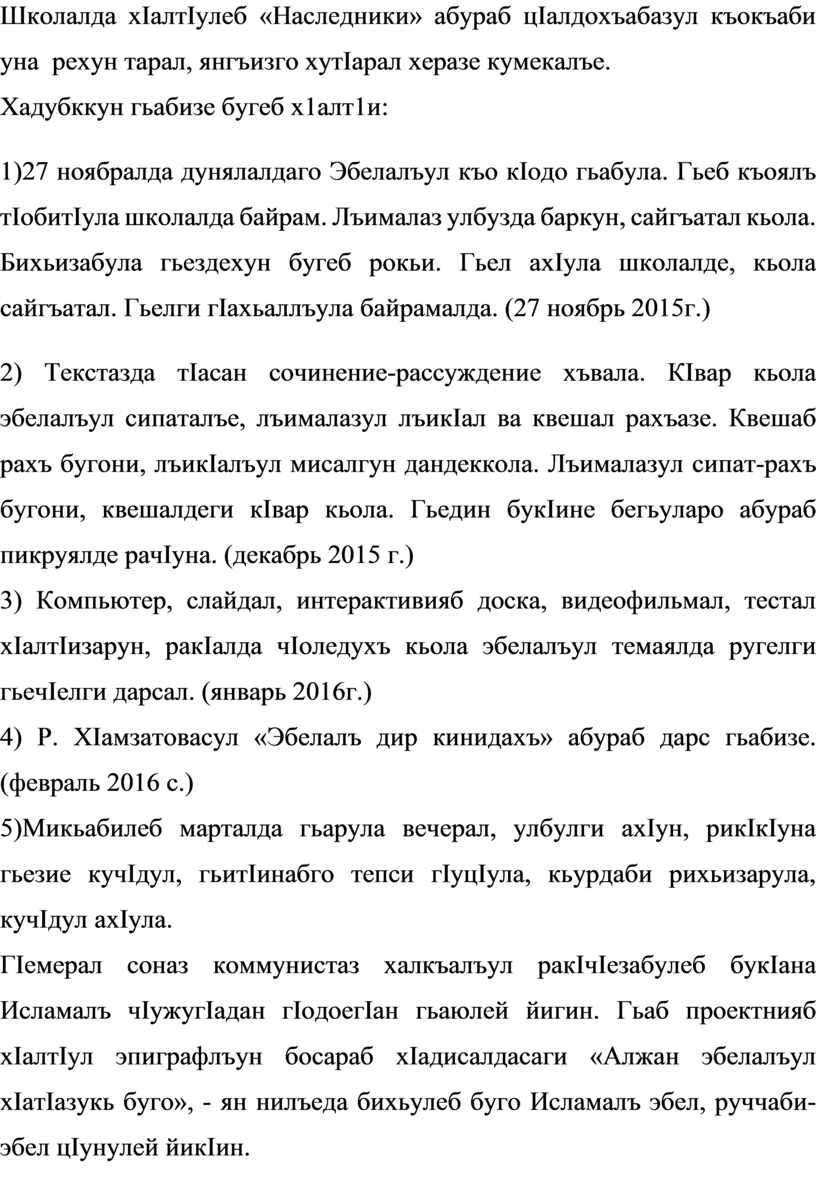 4) Р. ХIамзатовасул «Эбелалъ дир кинидахъ» абураб дарс гьабизе. (февраль 2016 с.)