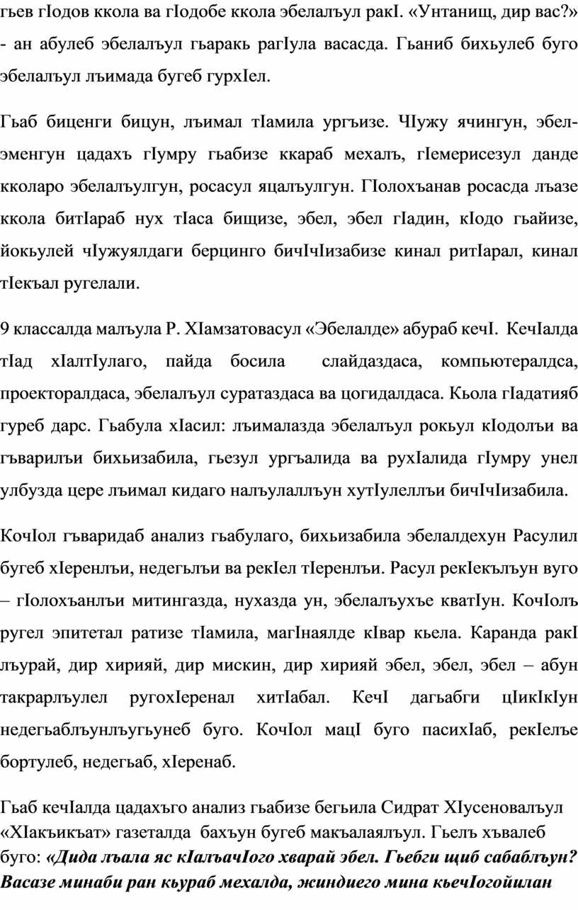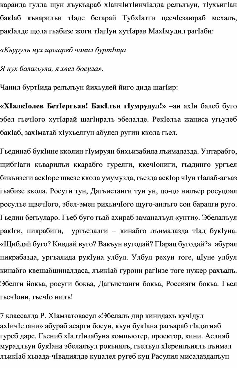 7 классалда Р. ХIамзатовасул «Эбелалъ дир кинидахъ кучIдул ахIичIелани» абураб асарги босун, кьун букIана рагьараб гIадатияб гуреб дарс. Гьениб хIалтIизабуна компьютер, проектор, кини. Аслияб мурадлъун букIана эбелалъул рокьиялъ, гьелъул хIеренлъиялъ лъимал лъикIаб хьвада-чIвадиялде куцалел ругеб куц Расулил мисалаздалъун бихьизабизе. Гьеб киналъулго кIиго приложениялда тIад планги буго, дарсил эпиграфлъун босун буго «Эбелалъул хIатIазукь буго алжан» абураб хIадис, дарсил эмблемалъун кини буго.