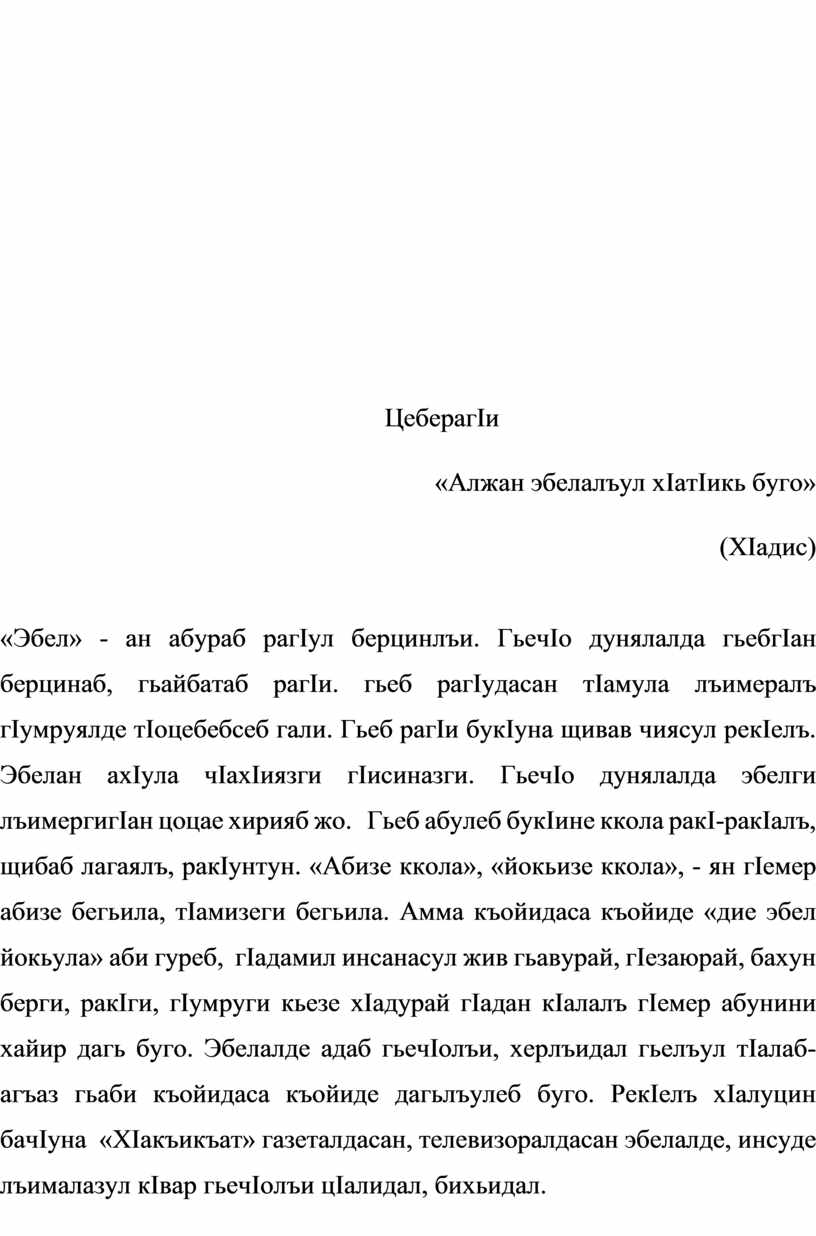 «Эбел» - ан абураб рагIул берцинлъи. ГьечIо дунялалда гьебгIан берцинаб, гьайбатаб рагIи. гьеб рагIудасан тIамула лъимералъ гIумруялде тIоцебебсеб гали. Гьеб рагIи букIуна щивав чиясул рекIелъ. Эбелан ахIула чIахIиязги гIисиназги. ГьечIо дунялалда эбелги лъимергигIан цоцае хирияб жо. Гьеб абулеб букIине ккола ракI-ракIалъ, щибаб лагаялъ, ракIунтун. «Абизе ккола», «йокьизе ккола», - ян гIемер абизе бегьила, тIамизеги бегьила. Амма къойидаса къойиде «дие эбел йокьула» аби гуреб, гIадамил инсанасул жив гьавурай, гIезаюрай, бахун берги, ракIги, гIумруги кьезе хIадурай гIадан кIалалъ гIемер абунини хайир дагь буго. Эбелалде адаб гьечIолъи, херлъидал гьелъул тIалаб-агъаз гьаби къойидаса къойиде дагьлъулеб буго. РекIелъ хIалуцин бачIуна «ХIакъикъат» газеталдасан, телевизоралдасан эбелалде, инсуде лъималазул кIвар гьечIолъи цIалидал, бихьидал.