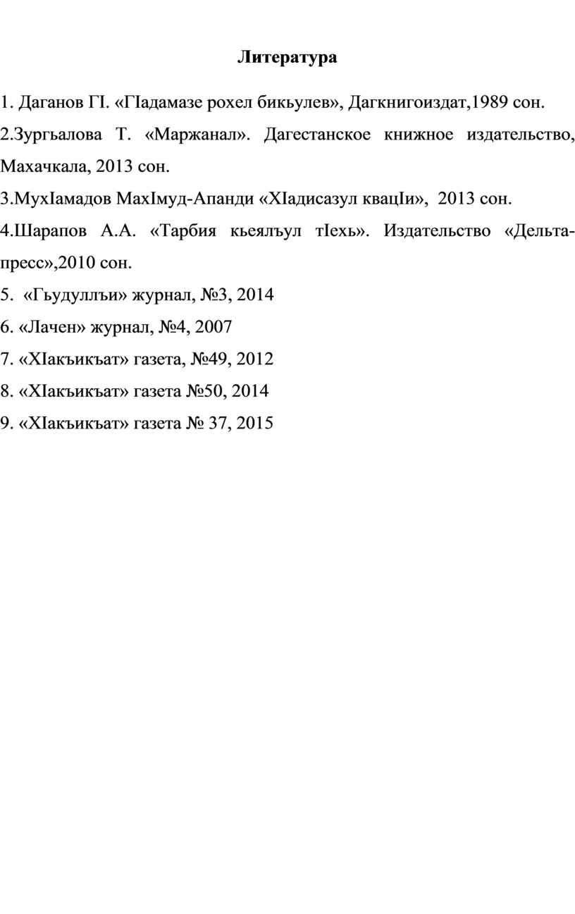 1. Даганов ГI. «ГIадамазе рохел бикьулев», Дагкнигоиздат,1989 сон.