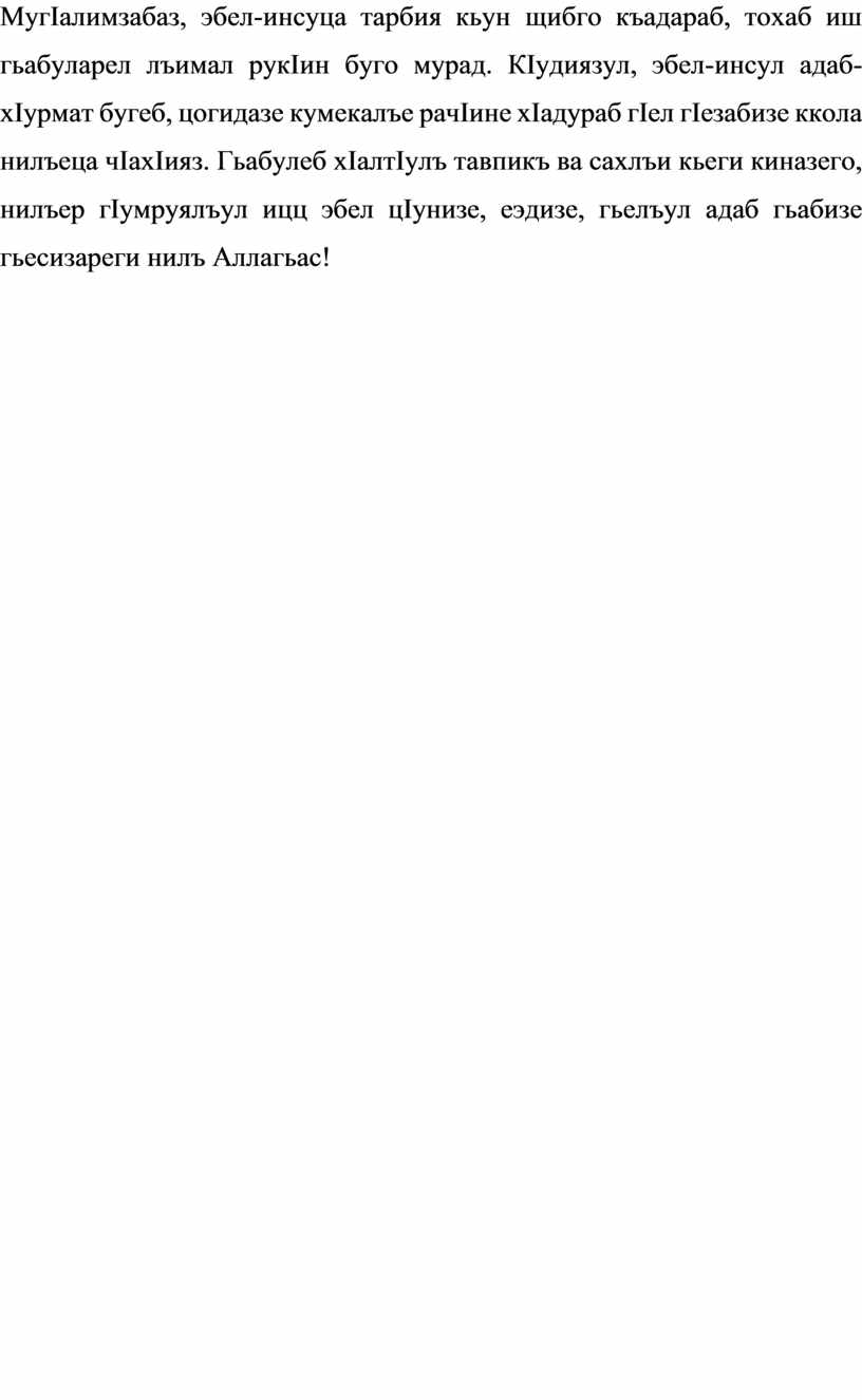 МугIалимзабаз, эбел-инсуца тарбия кьун щибго къадараб, тохаб иш гьабуларел лъимал рукIин буго мурад. КIудиязул, эбел-инсул адаб-хIурмат бугеб, цогидазе кумекалъе рачIине хIадураб гIел гIезабизе ккола нилъеца чIахIияз. Гьабулеб хIалтIулъ тавпикъ ва сахлъи кьеги киназего, нилъер гIумруялъул ицц эбел цIунизе, еэдизе, гьелъул адаб гьабизе гьесизареги нилъ Аллагьас!
