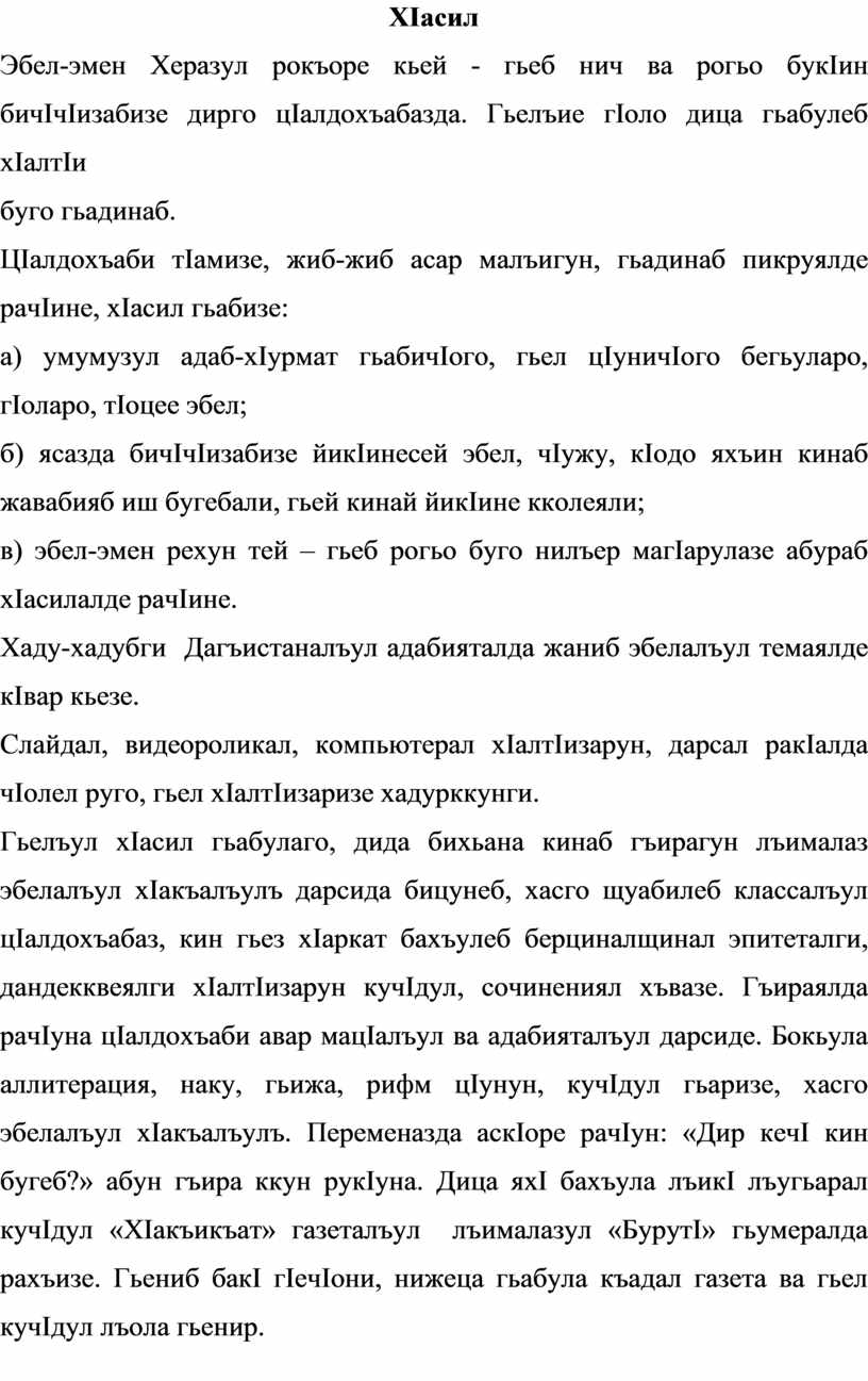 Нилъер, учительзабазул, аслияб масъала буго, эбелалъул темаялда асар малъулаго, жакъа къоялъ рехун тарал улбузул бугеб ахIвал-хIал рагьун цебелъезе, текстал цIалун, гьезул анализал гьарун, гьел битIараб нухде ккезе гьаризе.
