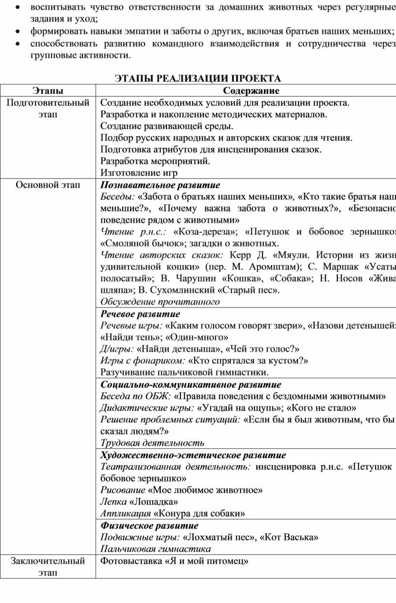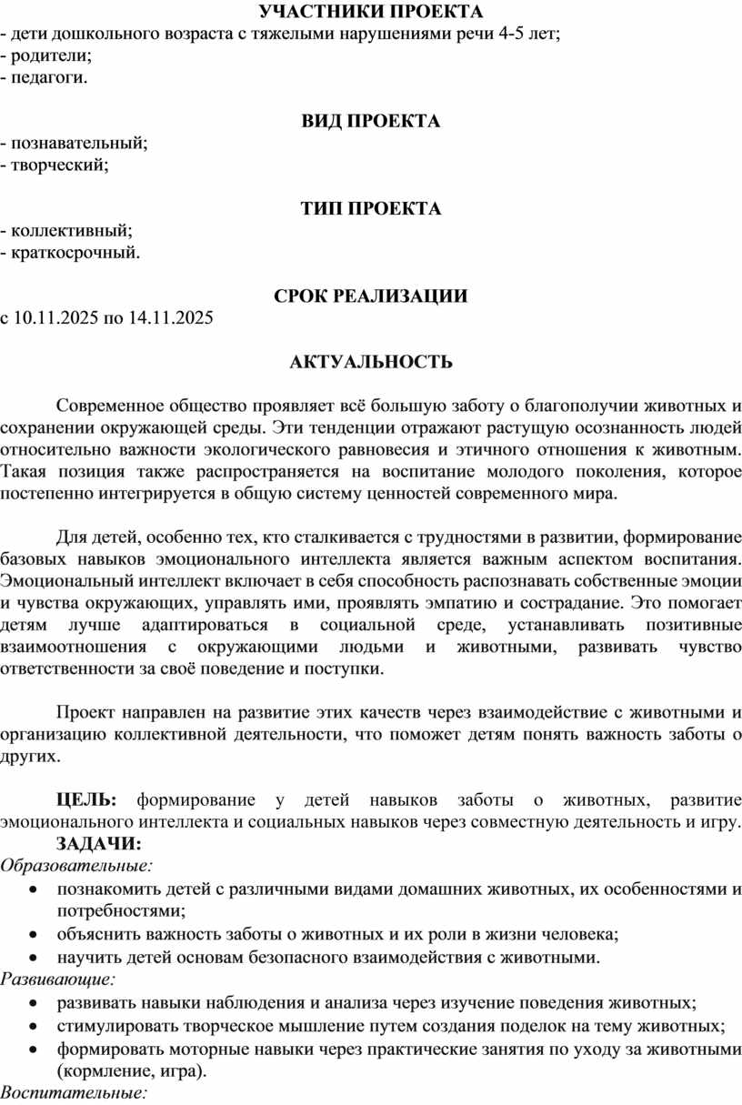 Проект направлен на развитие этих качеств через взаимодействие с животными и организацию коллективной деятельности, что поможет детям понять важность заботы о других.