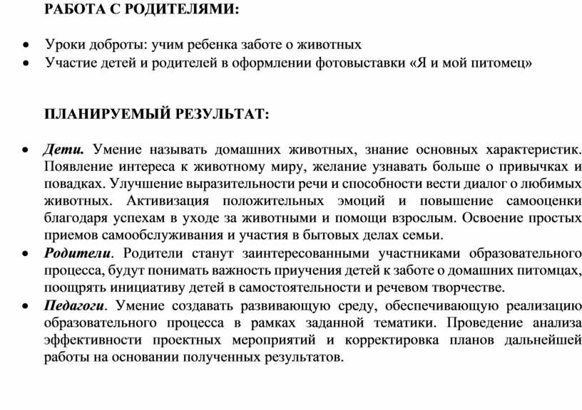 · Родители. Родители станут заинтересованными участниками образовательного процесса, будут понимать важность приучения детей к заботе о домашних питомцах, поощрять инициативу детей в самостоятельности и речевом творчестве.