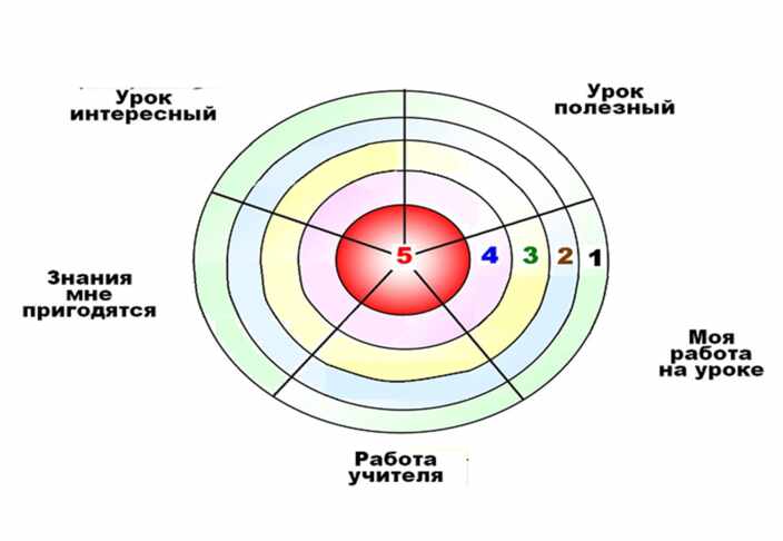 На доске рисуется мишень, которая делится на сектора. В каждом из секторов записываются параметры - вопросы рефлексии состоявшейся деятельности. Например, оценка содержания, оценка форм и методов проведения урока, оценка деятельности педагога, оценка своей деятельности. Участник ставит метки в сектора соответственно оценке результата: чем ближе к центру мишени, тем ближе к десятке, на краях мишени оценка ближе к нулю. Затем проводят её краткий анализ.