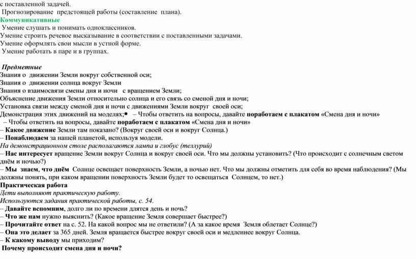 Предметные Знания о движении Земли вокруг собственной оси; Знания о движении солнца вокруг Земли Знания о взаимосвязи смены дня и ночи с вращением Земли; Объяснение движения Земли относительно солнца и его связь со сменой дня и ночи; Установка связи между сменой дня и ночи с движениями Земли вокруг своей оси; Демонстрация этих движений на моделях; |