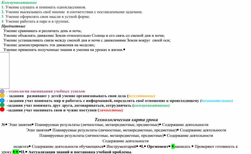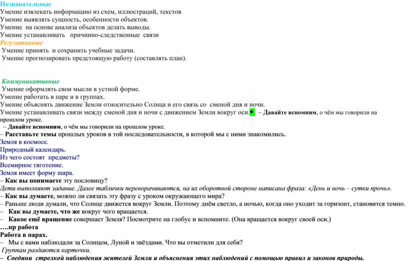 Коммуникативные Умение оформлять свои мысли в устной форме. Умение работать в паре и в группах. Умение объяснять движение Земли относительно Солнца и его связь со сменой дня и ночи. Умение устанавливать связи между сменой дня и ночи с движением Земли вокруг оси. |