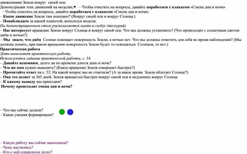 – Чтобы ответить на вопросы, давайте поработаем с плакатом «Смена дня и ночи» – Какое движение Земли там показано? (Вокруг своей оси и вокруг Солнца.) – Понаблюдаем за нашей планетой, используя модели. На демонстрационном столе располагаются лампа и глобус (теллурий) – Нас интересует вращение Земли вокруг Солнца и вокруг своей оси. Что мы должны установить? (Что происходит с солнечным светом днём и ночью?) – Мы знаем, что днём Солнце освещает поверхность Земли, а ночью нет. Что мы должны отметить для себя во время наблюдения? (Мы должны понять, при каком вращении поверхность Земли будет то освещаться Солнцем, то нет.) Практическая работа Дети выполняют практическую работу. Используются задания практической работы, с. 54. – Давайте вспомним, долго ли по времени длятся день и ночь? – Что же нам нужно выяснить? (Какое вращение Земля совершает быстрее?) – Прочитайте ответ на с. 52. На какой вопрос мы не ответили? (А за какое время Земля облетает Солнце?) – Она это делает за 365 дней. Земля вращается быстрее вокруг своей оси и медленнее вокруг Солнца. – К какому выводу мы приходим? Почему происходит смена дня и ночи?
