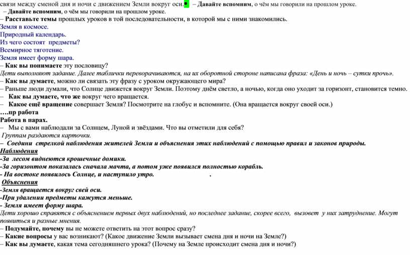 – Давайте вспомним, о чём мы говорили на прошлом уроке. – Расставьте темы прошлых уроков в той последовательности, в которой мы с ними знакомились. Земля в космосе. Природный календарь. Из чего состоят предметы? Всемирное тяготение. Земля имеет форму шара. – Как вы понимаете эту пословицу? Дети выполняют задание. Далее таблички переворачиваются, на их оборотной стороне написана фраза: «День и ночь – сутки прочь». – Как вы думаете, можно ли связать эту фразу с уроком окружающего мира? – Раньше люди думали, что Солнце движется вокруг Земли. Поэтому днём светло, а ночью, когда оно уходит за горизонт, становится темно. – Как вы думаете, что же вокруг чего вращается. – Какое ещё вращение совершает Земля? Посмотрите на глобус и вспомните. (Она вращается вокруг своей оси.) ….пр работа Работа в парах. – Мы с вами наблюдали за Солнцем, Луной и звёздами. Что вы отметили для себя? Группам раздаются карточки. – Соедини стрелкой наблюдения жителей Земли и объяснения этих наблюдений с помощью правил и законов природы. Наблюдения -За лесом виднеются крошечные домики. -За горизонтом показалась сначала мачта, а потом уже появился полностью корабль. - На востоке появилось Солнце, и наступило утро. . Объяснения -Земля вращается вокруг свей оси. -При удалении предметы кажутся меньше. - Земля имеет форму шара. Дети хорошо справятся с объяснением первых двух наблюдений, но последнее задание, скорее всего, вызовет у них затруднение. Могут появиться и разные мнения. – Подумайте, почему вы не можете ответить на этот вопрос сразу? – Какие вопросы у вас возникают? (Какое движение Земли вызывает смена дня и ночи на Земле?) – Как вы думаете, какая тема сегодняшнего урока? (Почему на Земле происходит смена дня и ночи?)