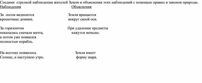 Соедини стрелкой наблюдения жителей Земли и объяснения этих наблюдений с помощью правил и законов природы.