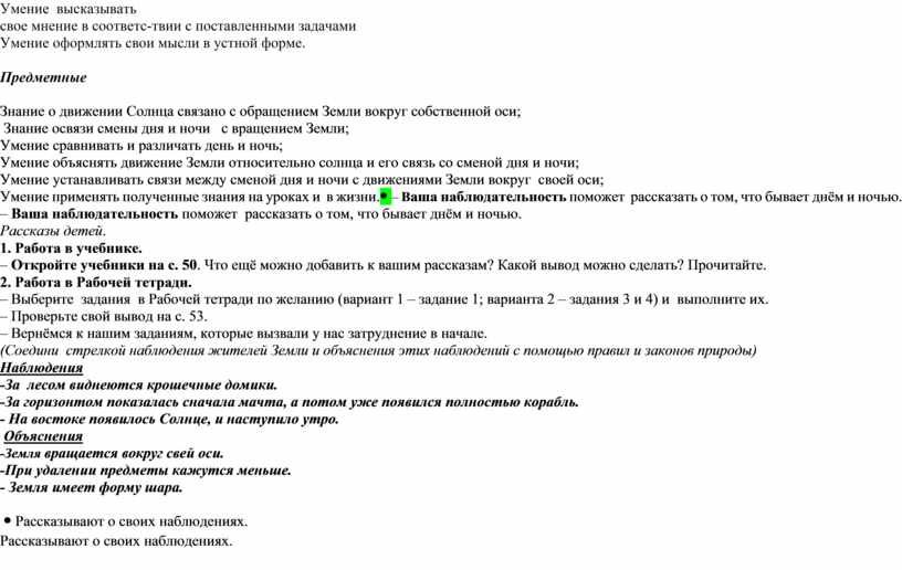 Знание о движении Солнца связано с обращением Земли вокруг собственной оси; Знание освязи смены дня и ночи с вращением Земли; Умение сравнивать и различать день и ночь; Умение объяснять движение Земли относительно солнца и его связь со сменой дня и ночи; Умение устанавливать связи между сменой дня и ночи с движениями Земли вокруг своей оси; Умение применять полученные знания на уроках и в жизни. |