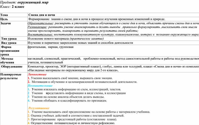 Регулятивные 1. Умение высказывать своё предположение на основе работы с материалом учебника. 2. Оценка учебных действий в соответствии с поставленной задачей. 3. Прогнозирование предстоящей работы (составление плана). 4. Осуществление познавательную и личностную рефлексию. Коммуникативные 1. Умение слушать и понимать одноклассников. 2. Умение высказывать своё мнение в соответствии с поставленными задачами. 3 Умение оформлять свои мысли в устной форме. 4 Умение работать в паре и в группах. Предметные Умение сравнивать и различать день и ночь; Умение объяснять движение Земли относительно Солнца и его связь со сменой дня и ночи; Умение устанавливать связи между сменой дня и ночи с движениями Земли вокруг своей оси; Умение демонстрировать эти движения на моделях; Умение применять полученные знания и умения на уроках в жизни. |