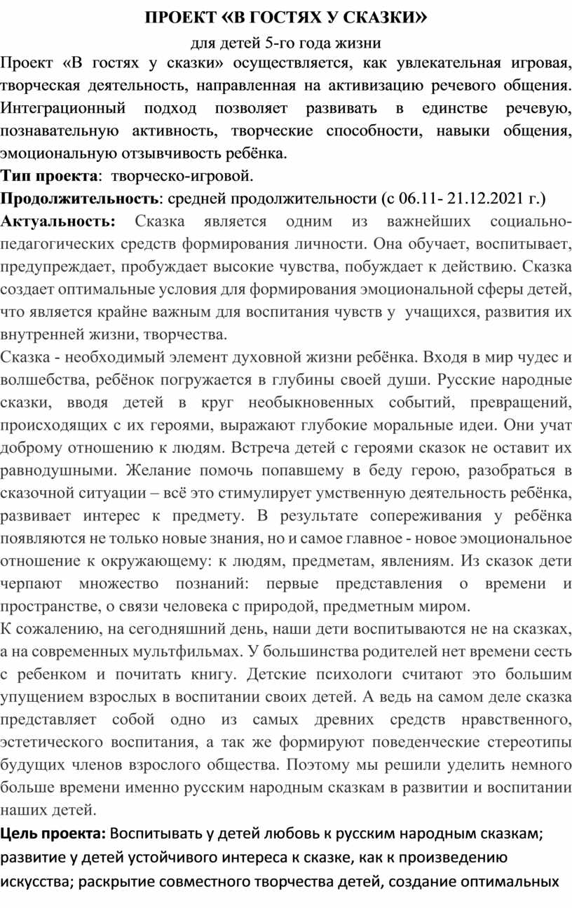 Проект «В гостях у сказки» осуществляется, как увлекательная игровая, творческая деятельность, направленная на активизацию речевого общения. Интеграционный подход позволяет развивать в единстве речевую, познавательную активность, творческие способности, навыки общения, эмоциональную отзывчивость ребёнка.