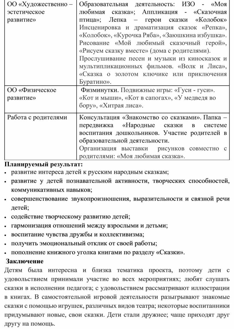 Детям была интересна и близка тематика проекта, поэтому дети с удовольствием принимали участие во всех мероприятиях; любят слушать сказки в исполнении педагога; с удовольствием рассматривают иллюстрации в книгах. В самостоятельной игровой деятельности разыгрывают знакомые сказки с помощью игрушек, различных видов театра; некоторые воспитанники придумывают новые, свои сказки. Дети стали дружнее; чаще приходят друг другу на помощь.