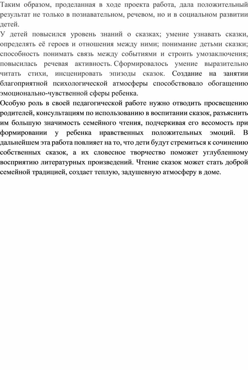 У детей повысился уровень знаний о сказках; умение узнавать сказки, определять её героев и отношения между ними; понимание детьми сказки; способность понимать связь между событиями и строить умозаключения; повысилась речевая активность. Сформировалось умение выразительно читать стихи, инсценировать эпизоды сказок. Создание на занятии благоприятной психологической атмосферы способствовало обогащению эмоционально-чувственной сферы ребенка.