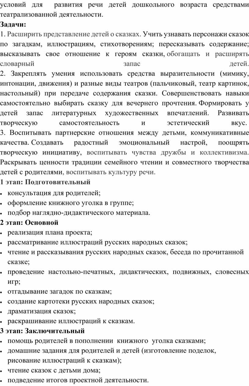 Цель проекта: Воспитывать у детей любовь к русским народным сказкам; развитие у детей устойчивого интереса к сказке, как к произведению искусства; раскрытие совместного творчества детей, создание оптимальных условий для развития речи детей дошкольного возраста средствами театрализованной деятельности.