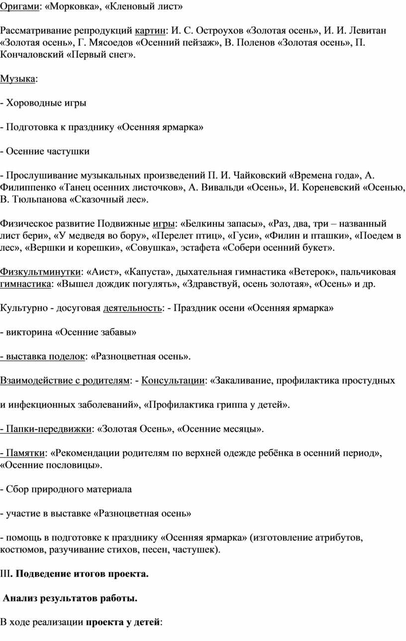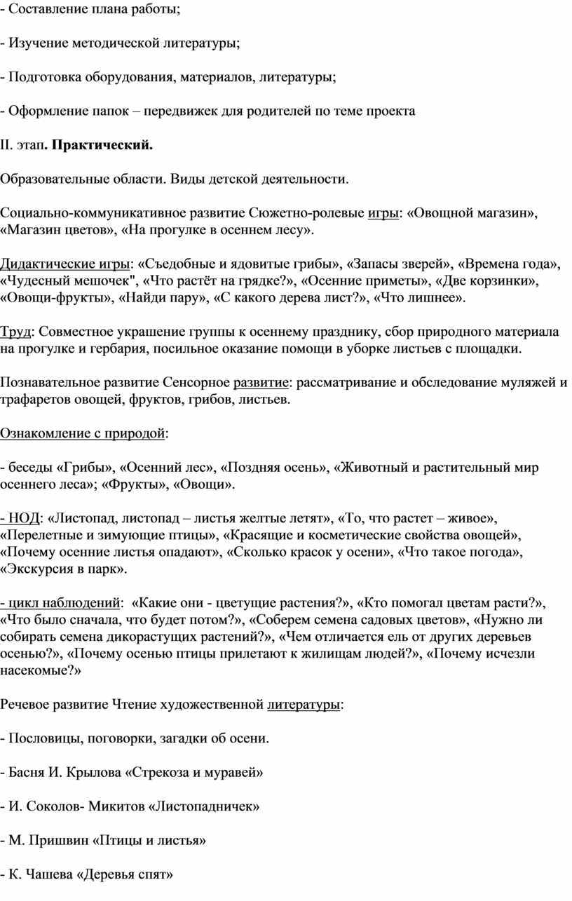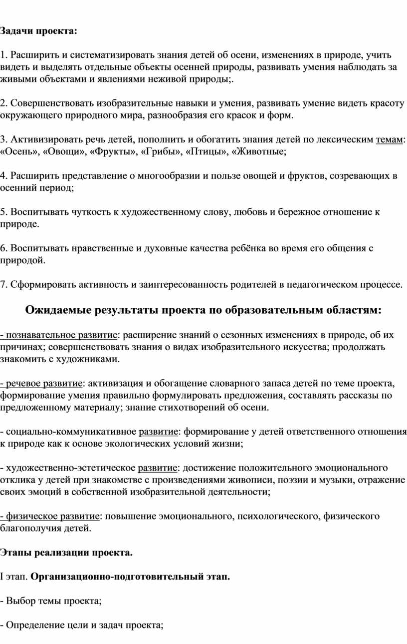 - речевое развитие: активизация и обогащение словарного запаса детей по теме проекта, формирование умения правильно формулировать предложения, составлять рассказы по предложенному материалу; знание стихотворений об осени.