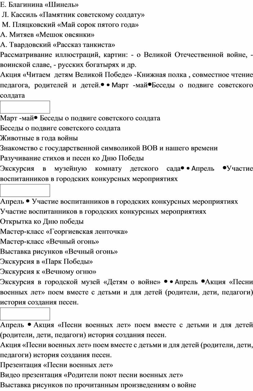 Беседы о подвиге советского солдата Животные в года войны Знакомство с государственной символикой ВОВ и нашего времени Разучивание стихов и песен ко Дню Победы Экскурсия в музейную комнату детского сада |