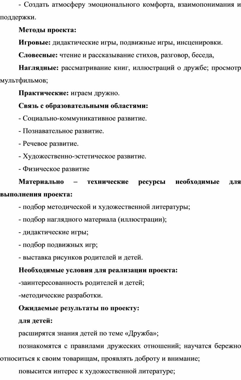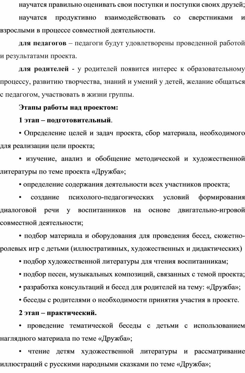 • изучение, анализ и обобщение методической и художественной литературы по теме проекта «Дружба»;