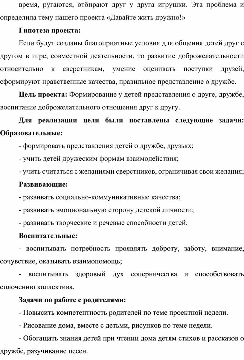Цель проекта: Формирование у детей представления о друге, дружбе, воспитание доброжелательного отношения друг к другу.