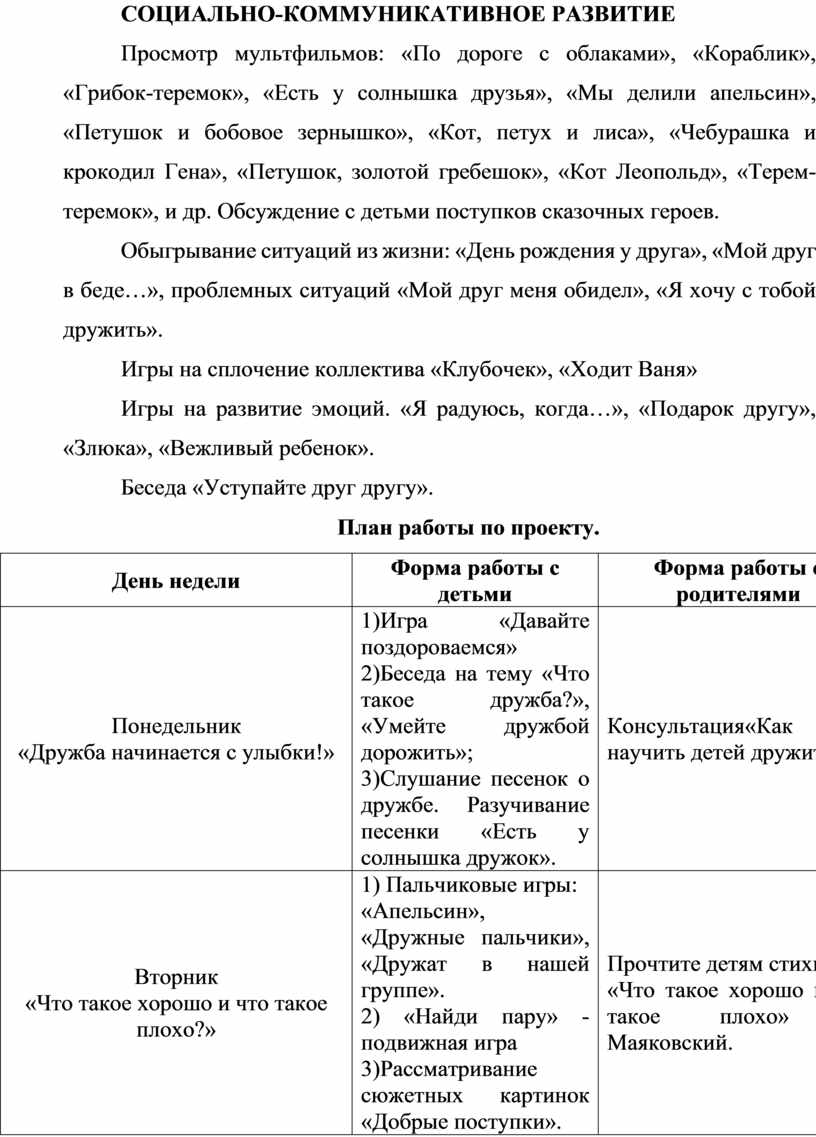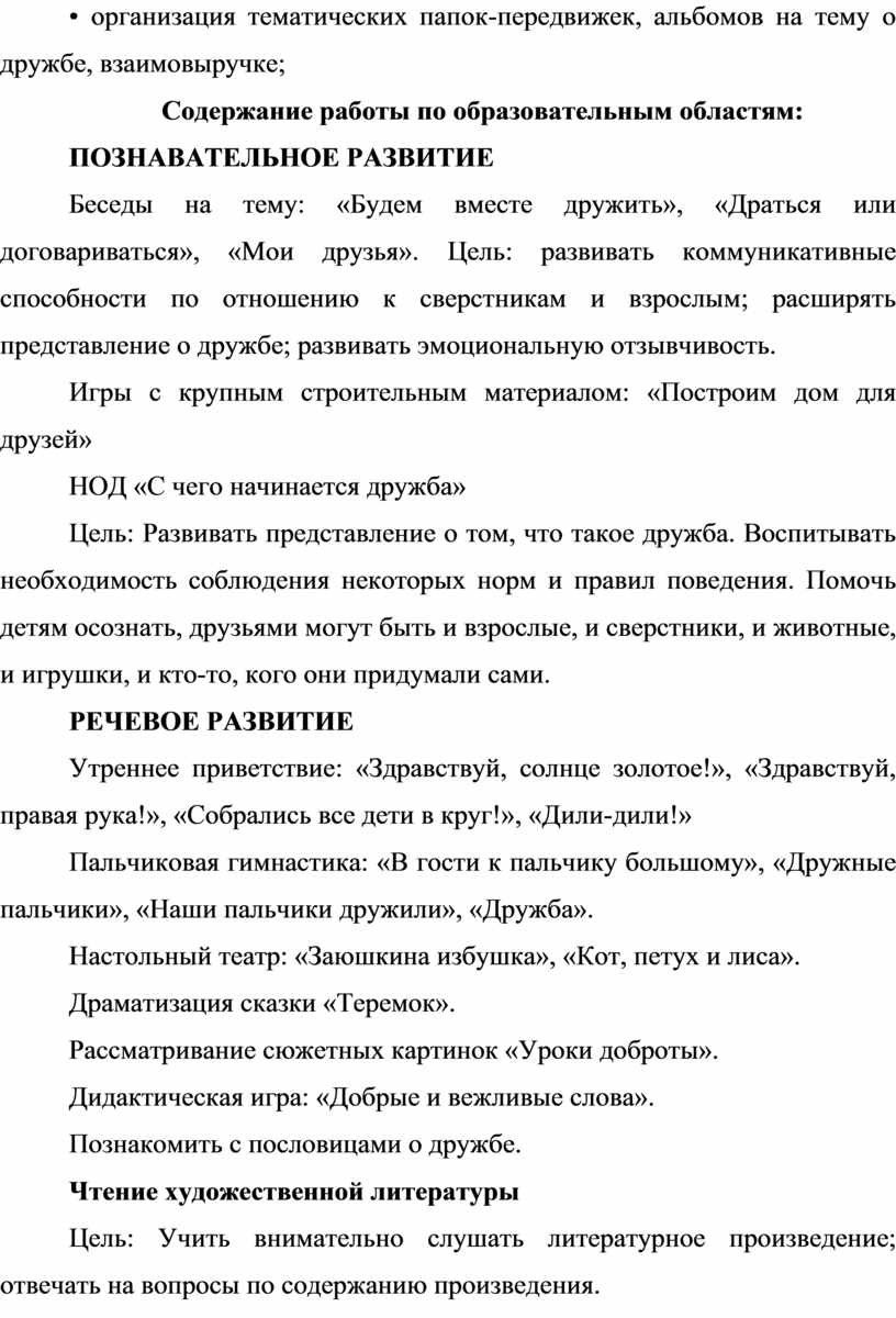 Чтение стихотворений: С. Михалков «Кто в дружбу верит горячо»; Ю. Белоусова «Дружба – это дар»; А. Кузнецова «Подружки», «Мой друг»; Ю. Энтин «Про дружбу»; Е. Благинина «Подарок»; С. Волков «В детском садике детишки.»; В. Маяковский «Что такое хорошо и что такое плохо»; В. Сутеев «Под грибом», «Палочка-выручалочка»; р.н.с. «Кот, петух и лиса»