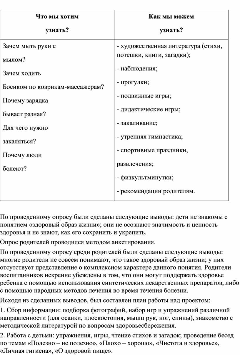 По проведенному опросу были сделаны следующие выводы: дети не знакомы с понятием «здоровый образ жизни»; они не осознают значимость и ценность здоровья и не знают, как его сохранить и укрепить.