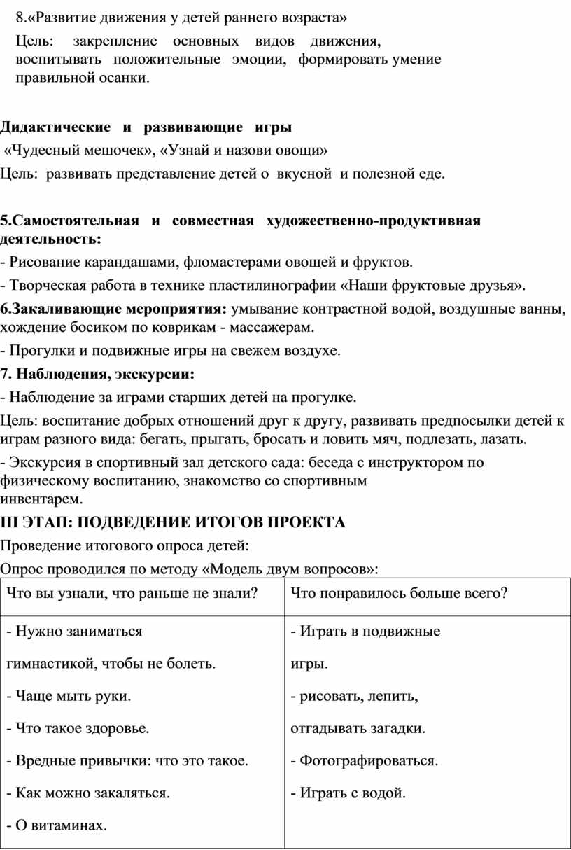 Перед проведением проекта проводился опрос воспитанников 2-ой младшей группы для выявления знаний детей о здоровом образе жизни. По окончании проекта проводился повторный (итоговый) опрос для анализа результатов.