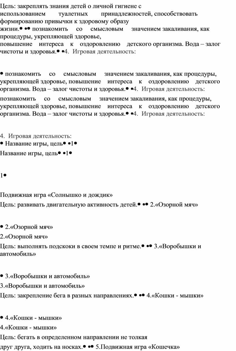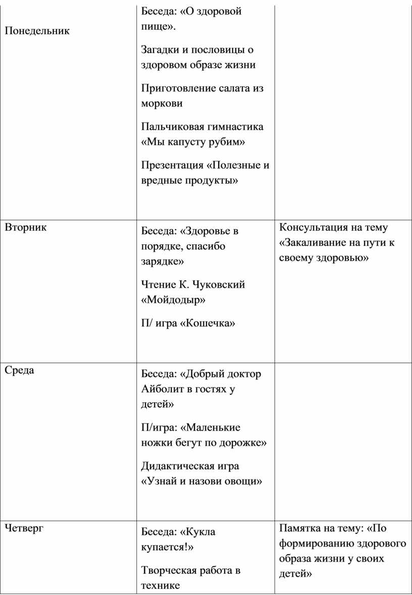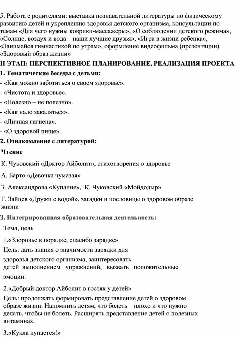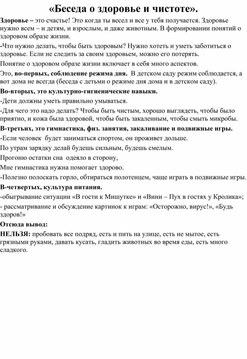 2. Работа с детьми: упражнения, игры, чтение стихов и загадок; проведение бесед по темам «Полезно – не полезно», «Плохо – хорошо», «Чистота и здоровье», «Личная гигиена», «О здоровой пище».