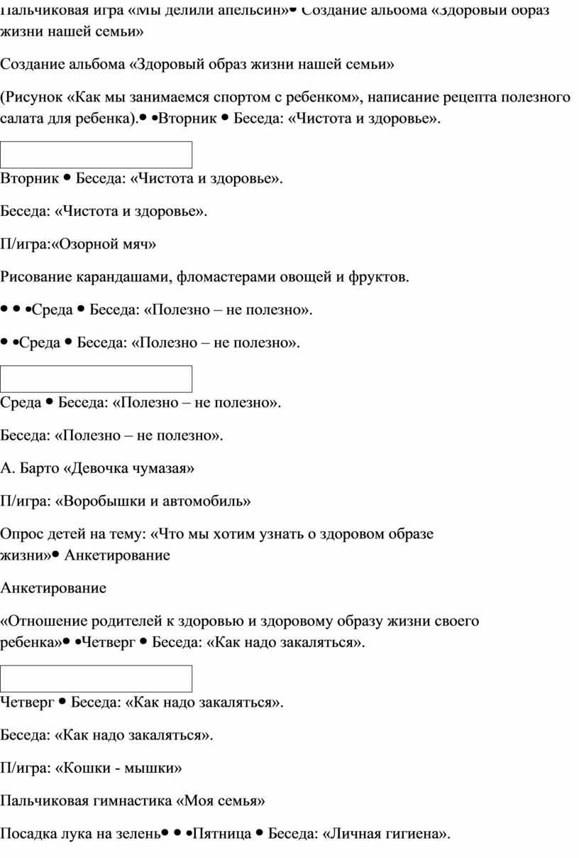 4. Совместная и самостоятельная деятельность: физкультурный уголок «Мы хотим быть здоровыми!», совместные дидактические игры, спортивные упражнения на все виды мышц, самостоятельная двигательная активность детей, творческая работа в технике пластилинографии «Наши фруктовые друзья».