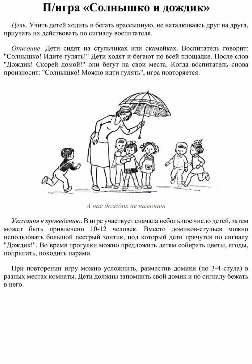 Описание. Дети сидят на стульчиках или скамейках. Воспитатель говорит: "Солнышко! Идите гулять!" Дети ходят и бегают по всей площадке. После слов "Дождик! Скорей домой!" они бегут на свои места. Когда воспитатель снова произносит: "Солнышко! Можно идти гулять", игра повторяется.