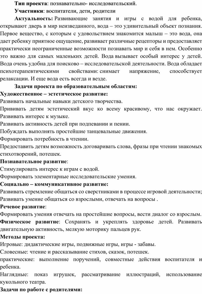Актуальность: Развивающие занятия и игры с водой для ребенка, открывают дверь в мир неизведанного, вода – это удивительный объект познания. Первое вещество, с которым с удовольствием знакомится малыш – это вода, она дает ребенку приятное ощущение, развивает различные рецепторы и предоставляет практически неограниченные возможности познавать мир и себя в нем. Особенно это важно для самых маленьких детей. Вода вызывает особый интерес у детей. Вода очень удобна для поисково – исследовательской деятельности. Вода обладает психотерапевтическими свойствами: снимает напряжение, способствует релаксации. И еще вода есть всегда и везде.