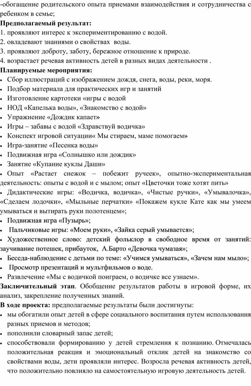 · способствовали формированию у детей стремления к познанию. Отмечалась положительная реакция и эмоциональный отклик детей на знакомство со свойствами воды, дети проявляли интерес. Возросла речевая активность детей, что положительно повлияло на самостоятельную игровую деятельность детей.