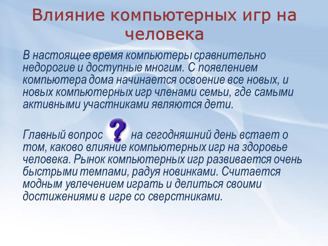 Главный вопрос на сегодняшний день встает о том, каково влияние компьютерных игр на здоровье человека. Рынок компьютерных игр развивается очень быстрыми темпами, радуя новинками. Считается модным увлечением играть и делиться своими достижениями в игре со сверстниками.