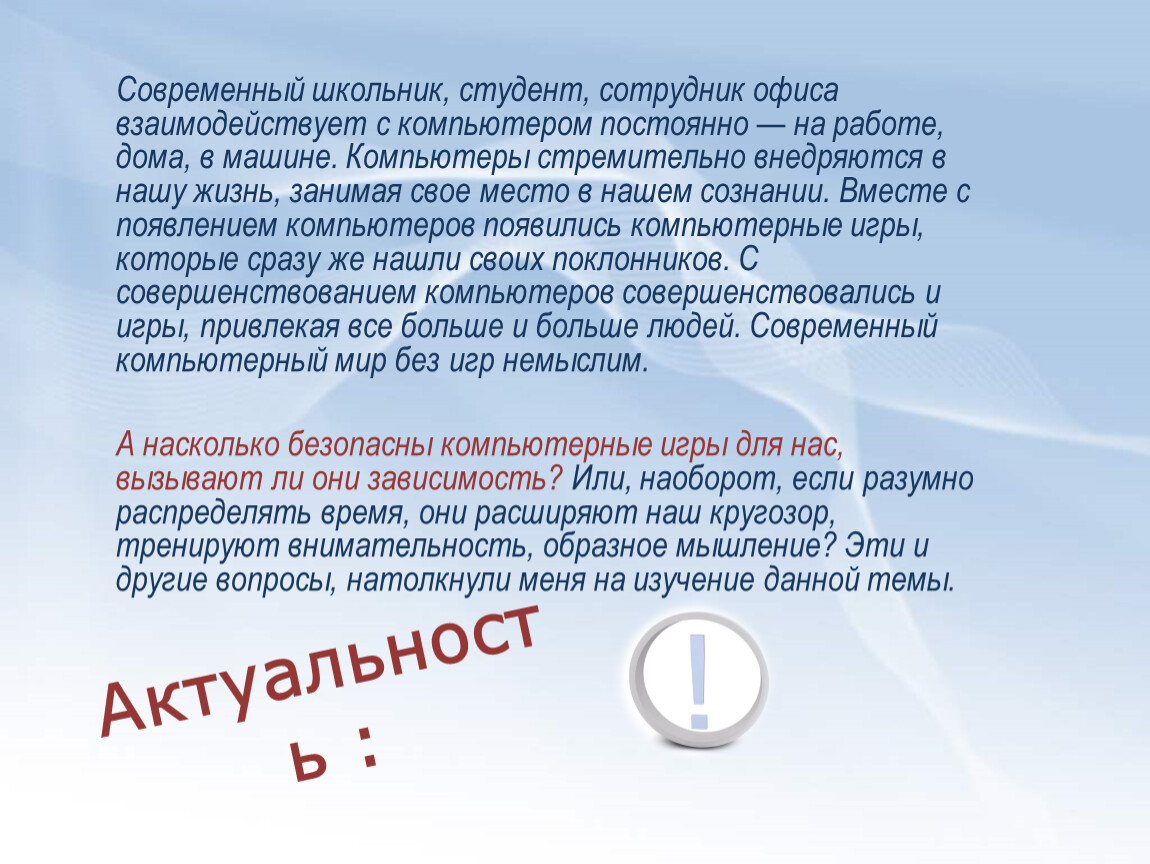 А насколько безопасны компьютерные игры для нас, вызывают ли они зависимость? Или, наоборот, если разумно распределять время, они расширяют наш кругозор, тренируют внимательность, образное мышление? Эти и другие вопросы, натолкнули меня на изучение данной темы.