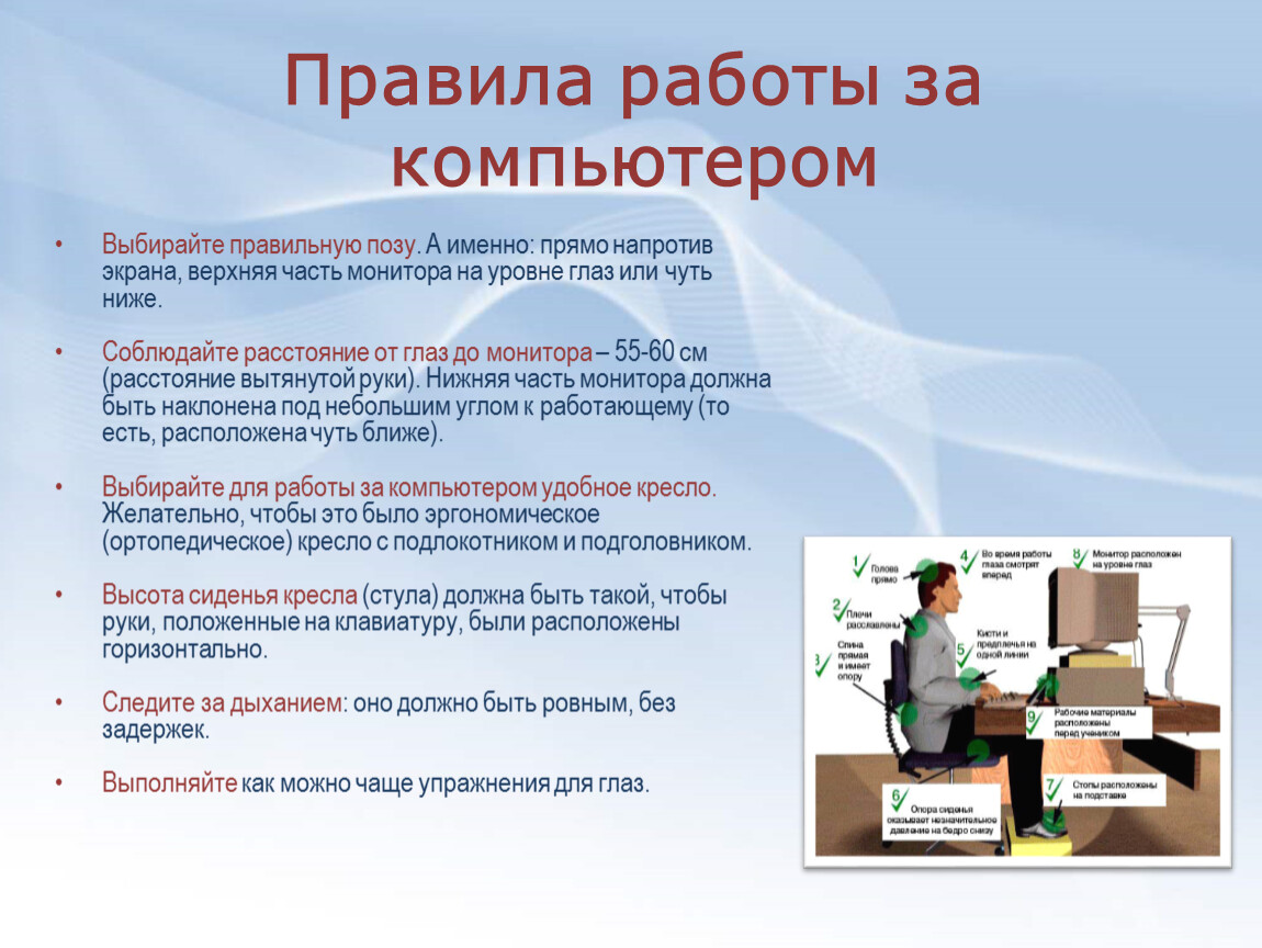 Соблюдайте расстояние от глаз до монитора – 55-60 см (расстояние вытянутой руки). Нижняя часть монитора должна быть наклонена под небольшим углом к работающему (то есть, расположена чуть ближе).