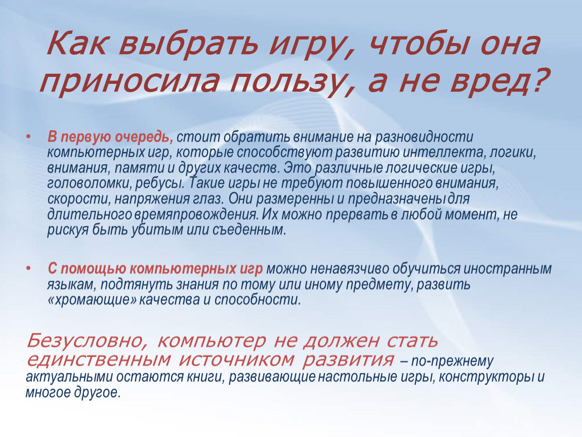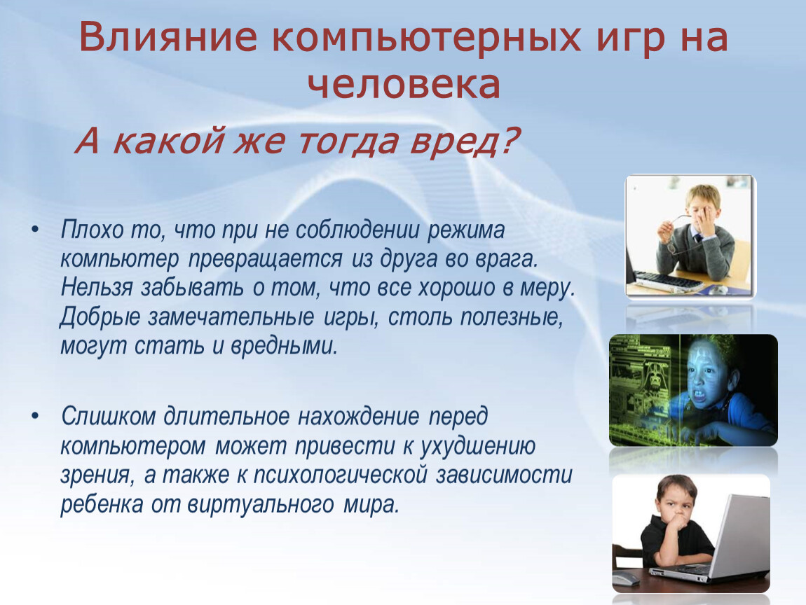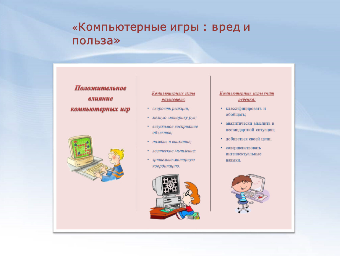 Влияние компьютерных игр на людей, и, детей в частности, неоднозначно. Нельзя сказать, что компьютерные игры – это плохо, и надо совсем отказаться от них. Как нельзя сказать, что хорошо, и можно играть сколько хочется и в любые игры. В компьютерных играх, как и во много другом, нужно пользоваться принципом не навреди. Компьютер, как и всё, что окружает нас, может быть и полезным, и вредным.