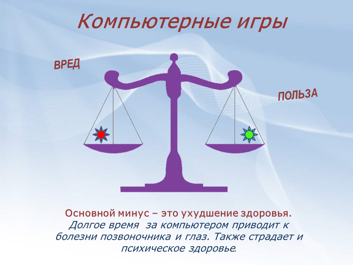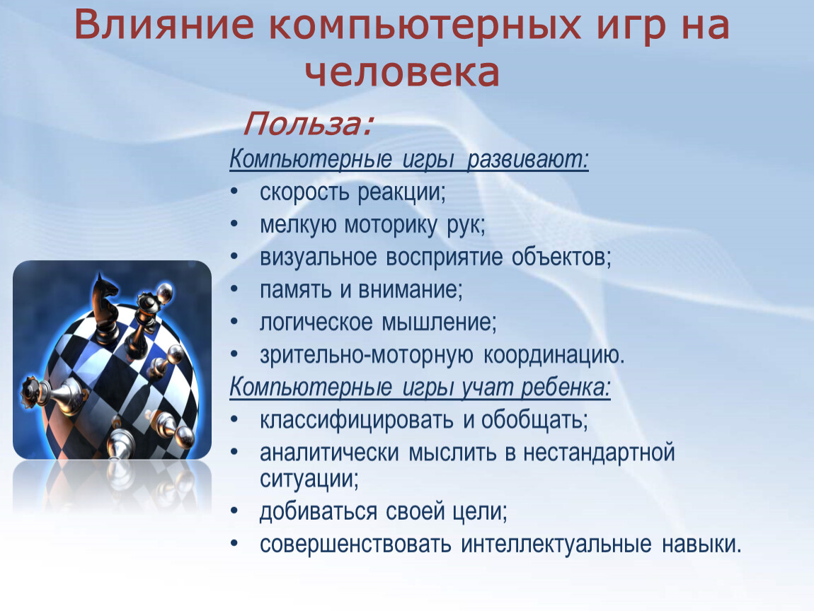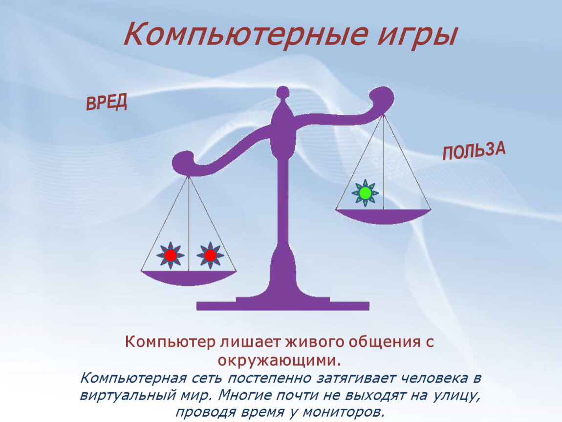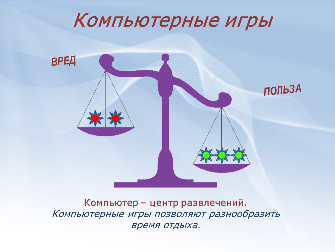 Влияние компьютерных игр на людей, и, детей в частности, неоднозначно. Нельзя сказать, что компьютерные игры – это плохо, и надо совсем отказаться от них. Как нельзя сказать, что хорошо, и можно играть сколько хочется и в любые игры. В компьютерных играх, как и во много другом, нужно пользоваться принципом не навреди. Компьютер, как и всё, что окружает нас, может быть и полезным, и вредным.
