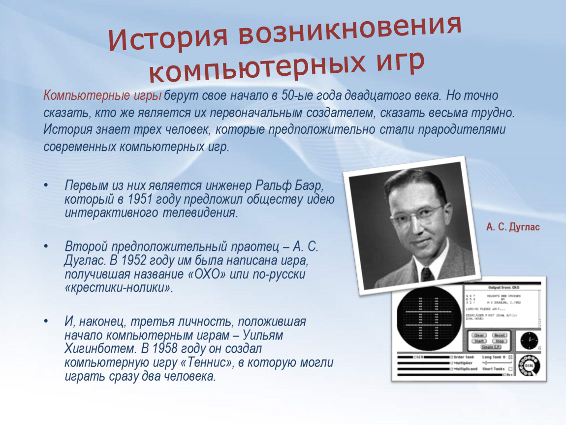 И, наконец, третья личность, положившая начало компьютерным играм – Уильям Хигинботем. В 1958 году он создал компьютерную игру «Теннис», в которую могли играть сразу два человека.