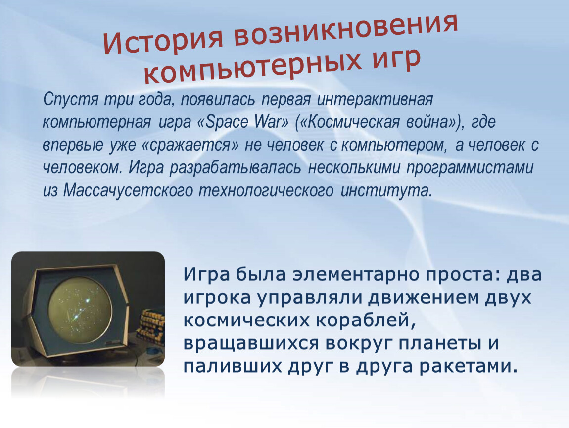 Спустя три года, появилась первая интерактивная компьютерная игра «Space War» («Космическая война»), где впервые уже «сражается» не человек с компьютером, а человек с человеком. Игра разрабатывалась несколькими программистами из Массачусетского технологического института.