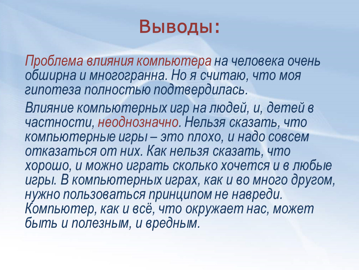 Проблема влияния компьютера на человека очень обширна и многогранна. Но я считаю, что моя гипотеза полностью подтвердилась.