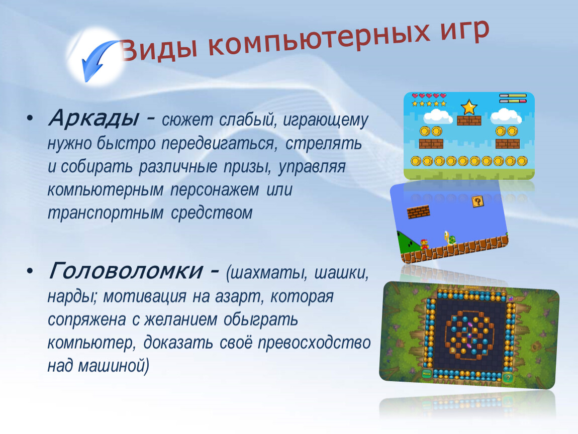 В первую очередь, стоит обратить внимание на разновидности компьютерных игр, которые способствуют развитию интеллекта, логики, внимания, памяти и других качеств. Это различные логические игры, головоломки, ребусы. Такие игры не требуют повышенного внимания, скорости, напряжения глаз. Они размеренны и предназначены для длительного времяпровождения. Их можно прервать в любой момент, не рискуя быть убитым или съеденным.