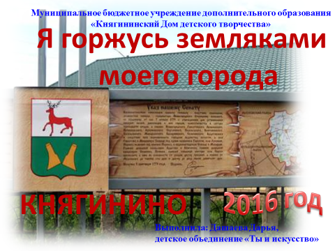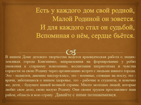 В нашем Доме детского творчества ведется краеведческая работа о людях-земляках города Княгинино, направленная на формирование у ребят уважения к старшему поколению, воспитания патриотизма и чувства гордости за свою Родину через организацию встреч с людьми нашего города. Это - педагоги, дающие мастер-класс, это - военные, стоящие на посту, это - врачи, заботящиеся о нашем здоровье, это - рабочие и студенты, и конечно же, дети, - будущее нашей великой страны. Много молодых людей, которые любят свое дело, свою малую Родину. Они своим трудом прославляют наш район, область и всю страну. Давайте с ними познакомимся.