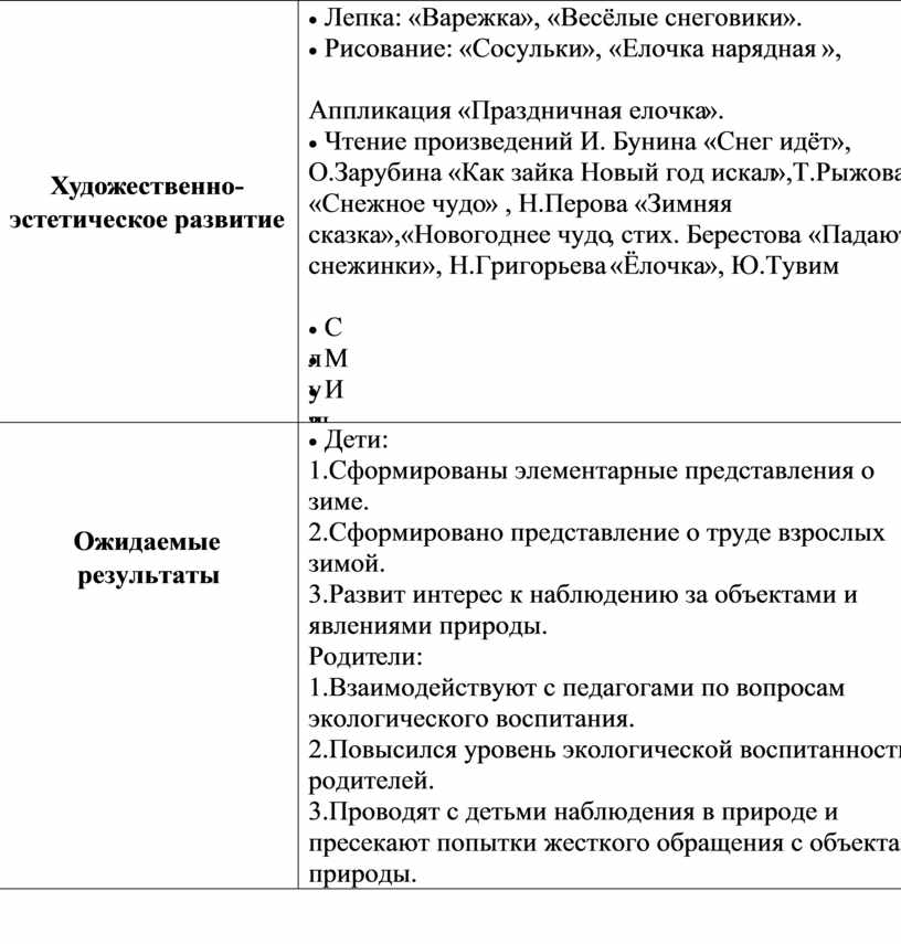 · Дети: 1.Сформированы элементарные представления о зиме. 2.Сформировано представление о труде взрослых зимой. 3.Развит интерес к наблюдению за объектами и явлениями природы. Родители: 1.Взаимодействуют с педагогами по вопросам экологического воспитания. 2.Повысился уровень экологической воспитанности родителей. 3.Проводят с детьми наблюдения в природе и пресекают попытки жесткого обращения с объектами природы. |