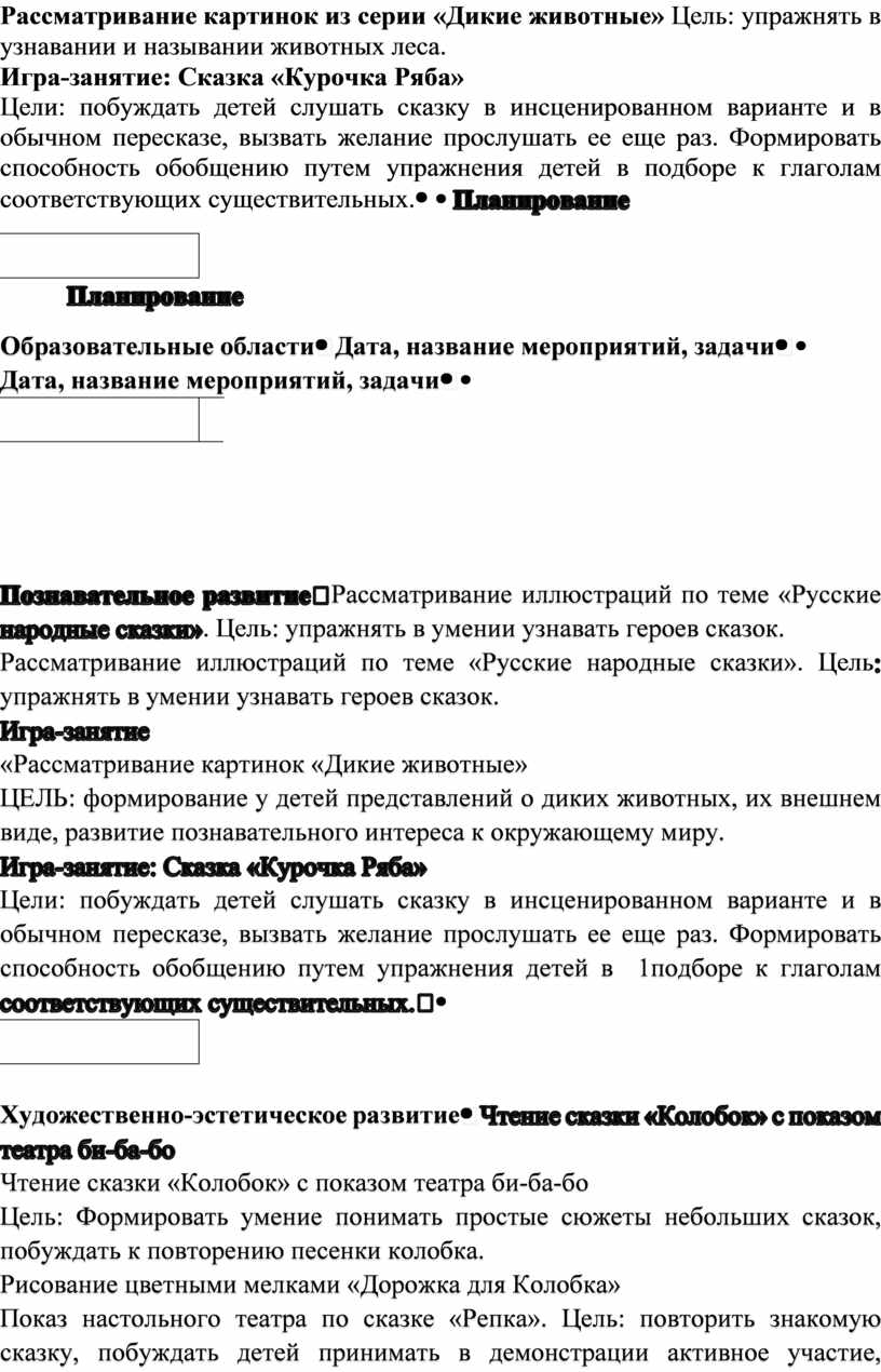 · Обогащение предметно-развивающей среды. · Книжный уголок: Предметные картинки, художественная литература по теме «Русские народные сказки» · Уголок сюжетно-ролевых игр: Появление театра би-ба-бо «Колобок», · Уголок продуктивной деятельности: Материалы и инструменты для рисования · Проведение игр-занятий, бесед, рассматривание иллюстраций, чтение и показ сказок, привлечение детей к совместной игровой деятельности |